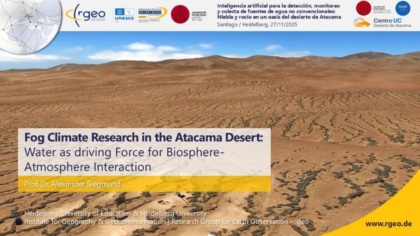 Im Rahmen einer internationalen Summer School präsentierte Prof. Dr. Alexander Siegmund aktuelle Forschungsergebnisse zum Nebelklima in der Atacama-Wüste. Der digitale Vortrag thematisierte Wasser als zentrale Triebkraft von Biosphären-Atmosphären-Interaktionen und innovative Ansätze zur Nutzung nicht-konventioneller Wasserquellen.
